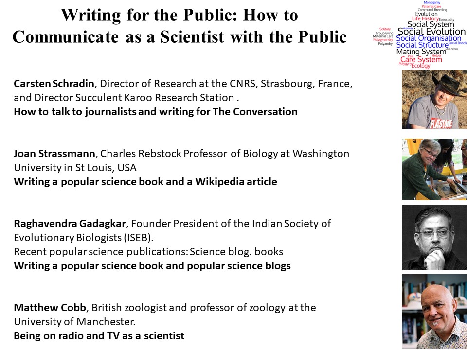These ideas were explored during a FINE panel discussion with Raghavendra Gadagkar (Indian Institute of Science), Joan Strassmann (Washington University in St Louis, USA), Matthew Cobb (University of Manchester, UK) and myself (CNRS in Strasbourg, France). Here, I focus on three key aspects: (1) interacting with journalists, (2) writing for the public, and (3) where to publish.