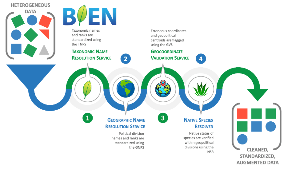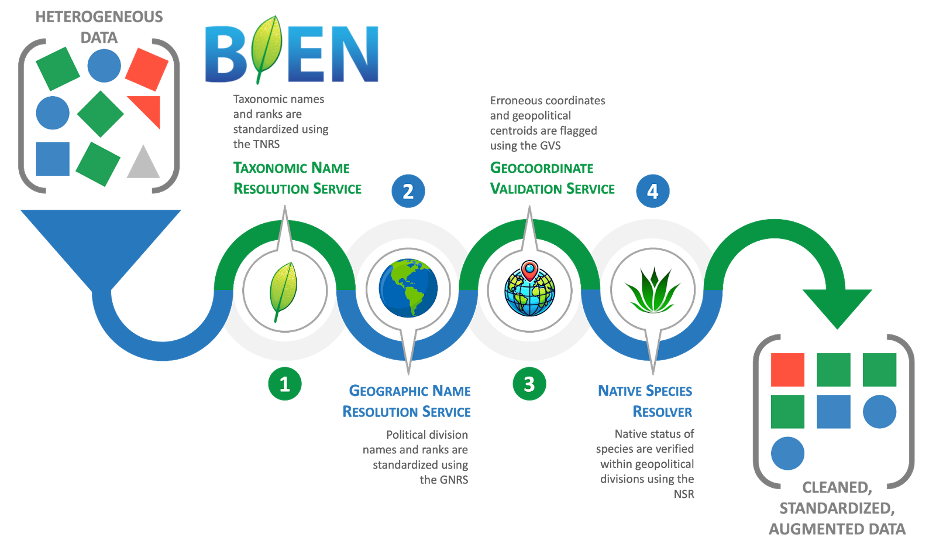 BIEN includes four core data standardization and cleaning services to integrate disparate data sources. Many of these tools can be used independently or together as a pipeline for plant and animal data, as well as other observational data, and are therefore useful for other applications and not specialized to plant occurrences. The end result is that these services can produce analysis-ready datasets.