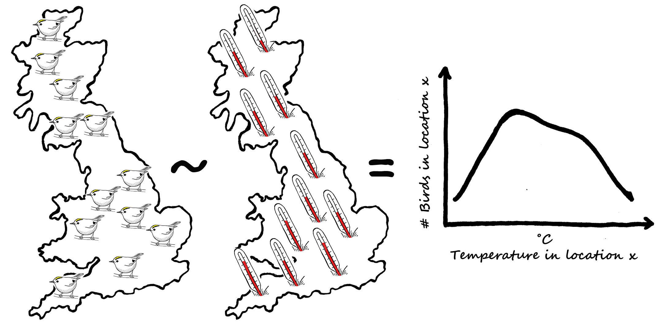When trying to understand how wildlife, for example a bird species, may react to climate change scientists generally study how species numbers vary in relation to climatic or weather variables (e.g. Renwick et al. 2012, Johnston et al. 2013). The way this tends to be done is by gathering information (data!) about bird numbers as well as the weather variables (for example temperature) in several locations (i.e. in space) and fitting a regression model to these data to detect and illustrate how bird numbers go up or down with temperature.